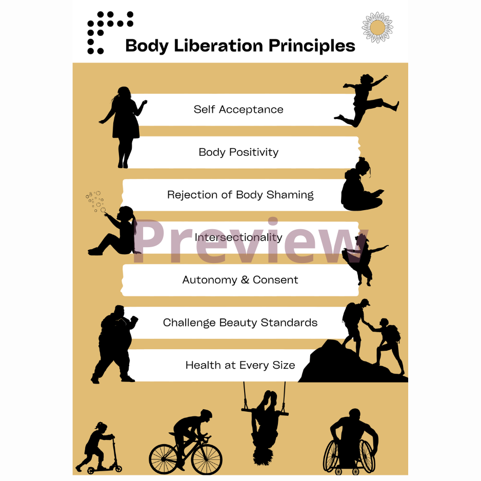 A yellow poster with silhouttes of various people surrounding the core tenet of body liberation.